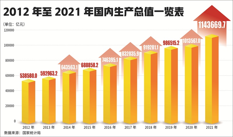 国内生产总值从2012年53.9万亿上升到2021年114.4万亿
