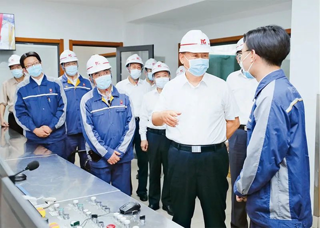 2020年8月18日至21日,中共中央总书记、国家主席、中央军委主席习近平在安徽省考察。这是19日上午,习近平在马鞍山市中国宝武马钢集团优质合金棒材车间考察,了解企业复工复产和经营情况。新华社记者 鞠鹏/摄
